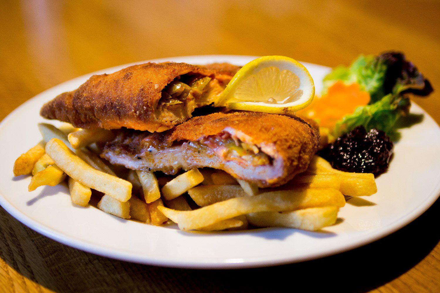 - Chili Schnitzelgefüllt mit Käse, Paprikastreifen und Chili mit Pommes und Salat